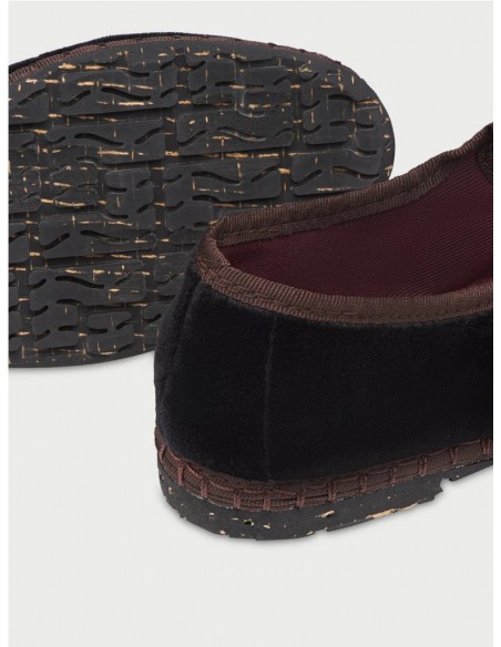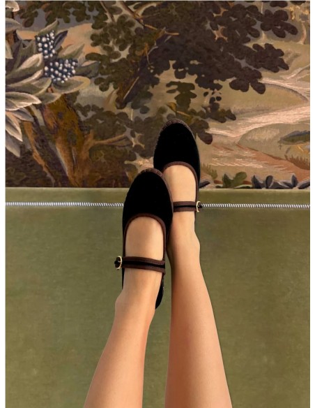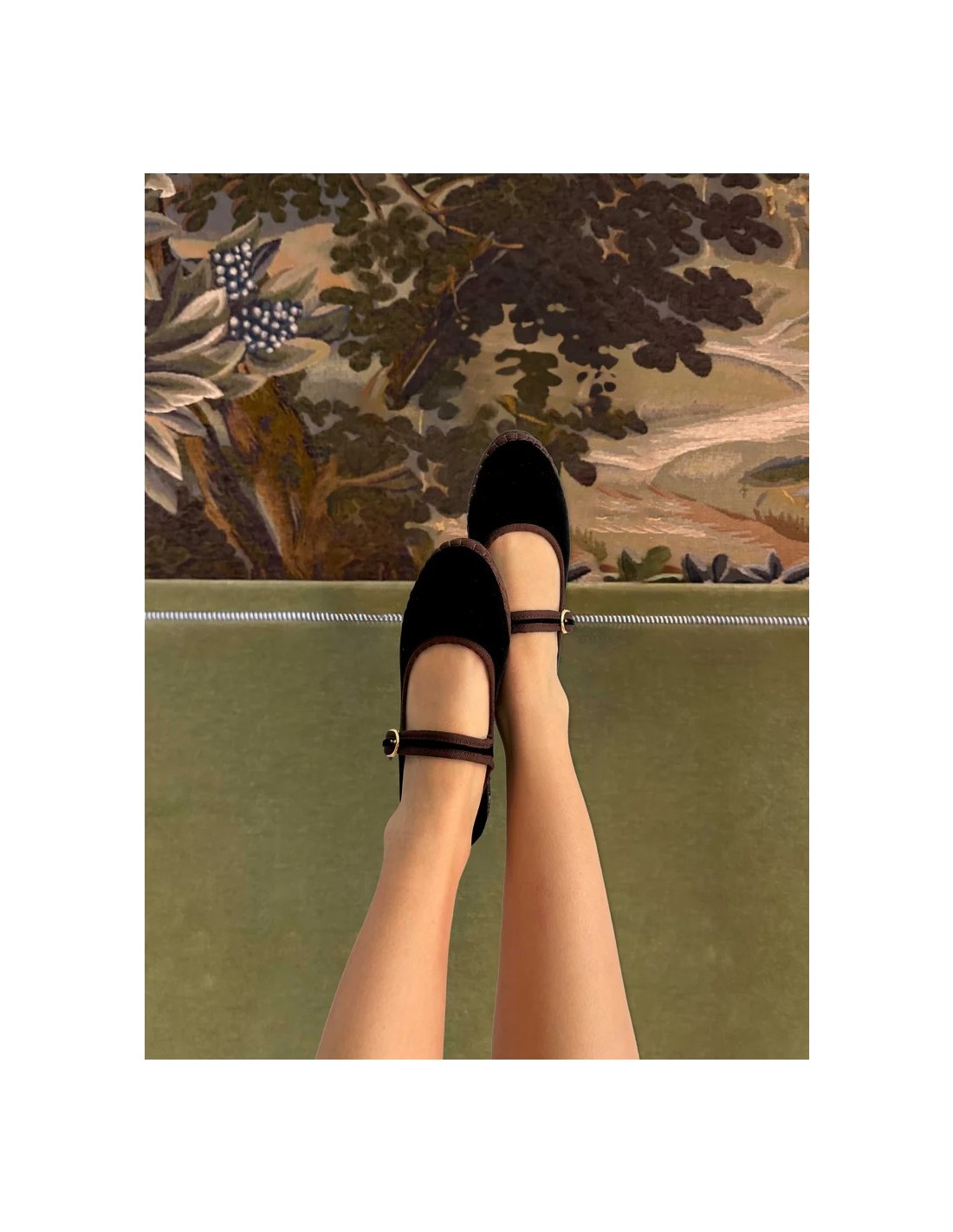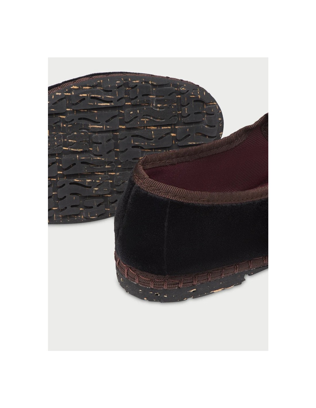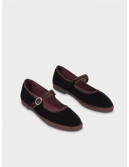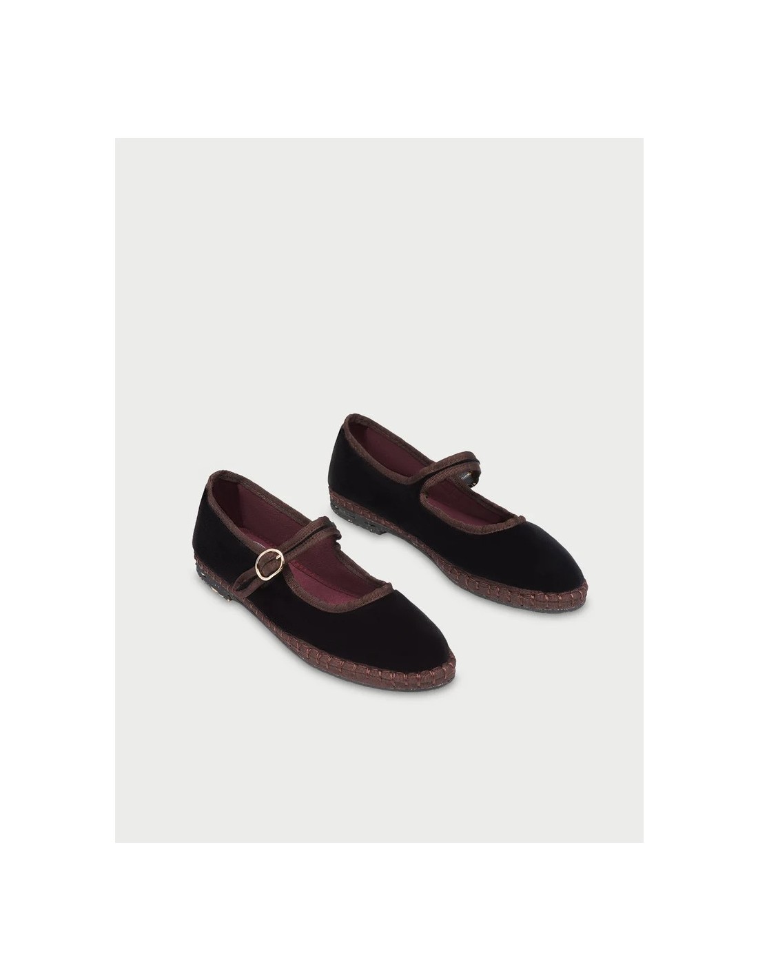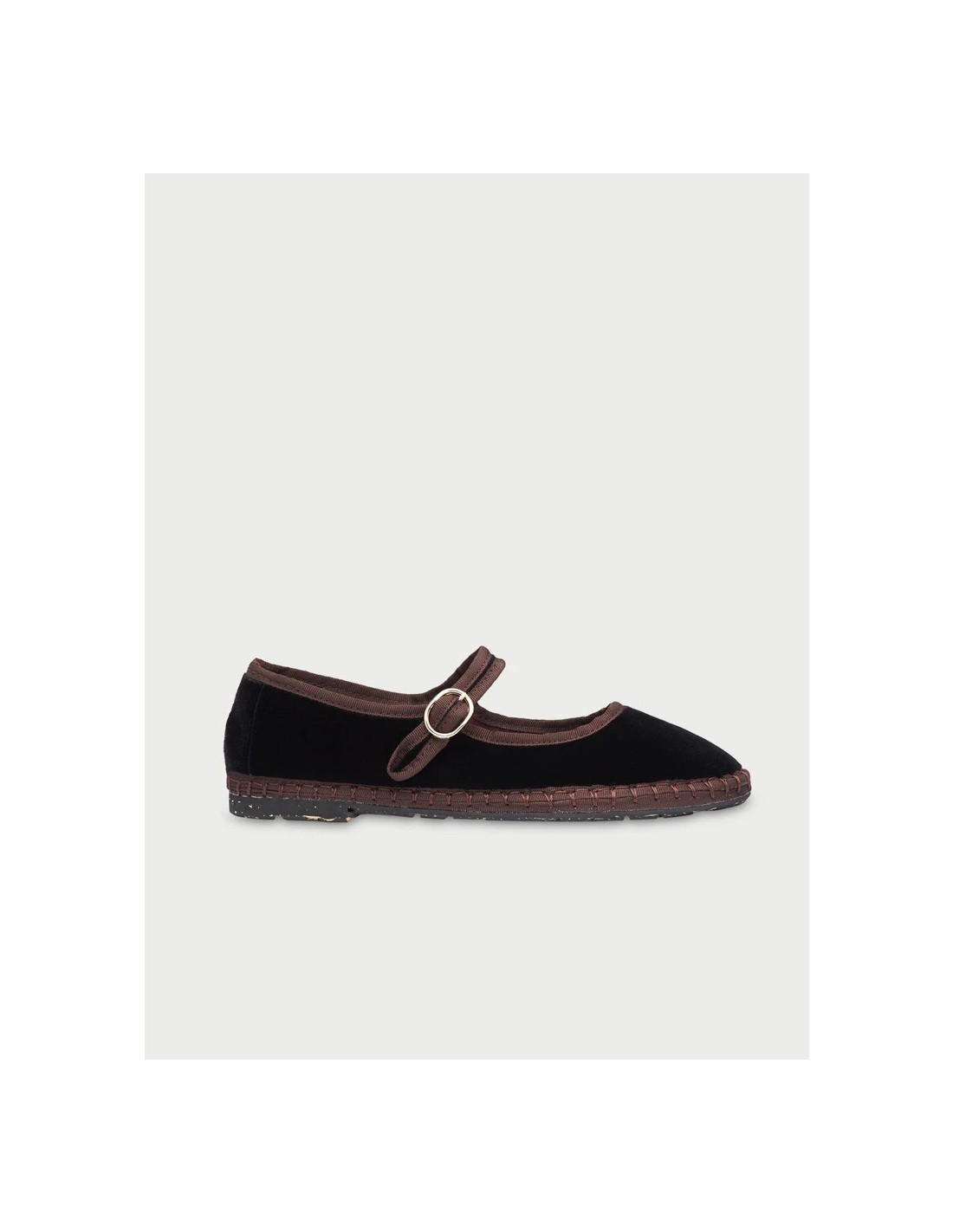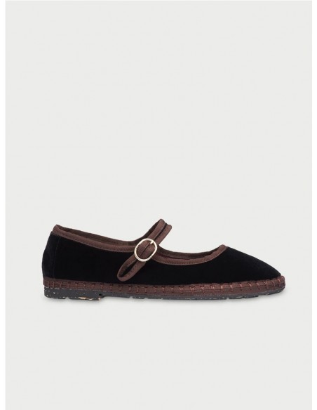 Mary jane de terciopelo en color negro con bordes marrones y cierre de hebilla. El exterior del zapato es 100% terciopelo de algodón y el interior del zapato es 100% algodón orgánico con tratamiento antibacteriano. La suela está hecha de caucho producido a partir de neumáticos de bicicleta reciclados.