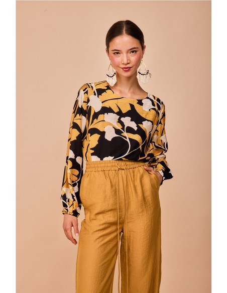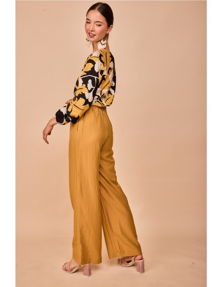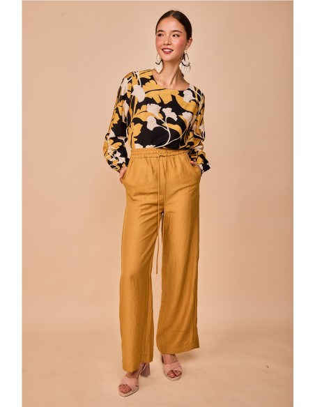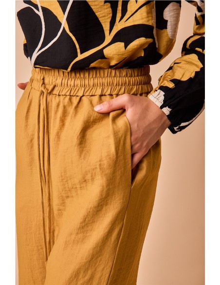 Elegante pantalón en tono dorado con cinturilla elástica que se adapta genial a la silueta, diseñado para sentirse cómoda y favorecer a todas. Combínalo con otras prendas lisas o con camisas a juego para un look completo con un toque original.