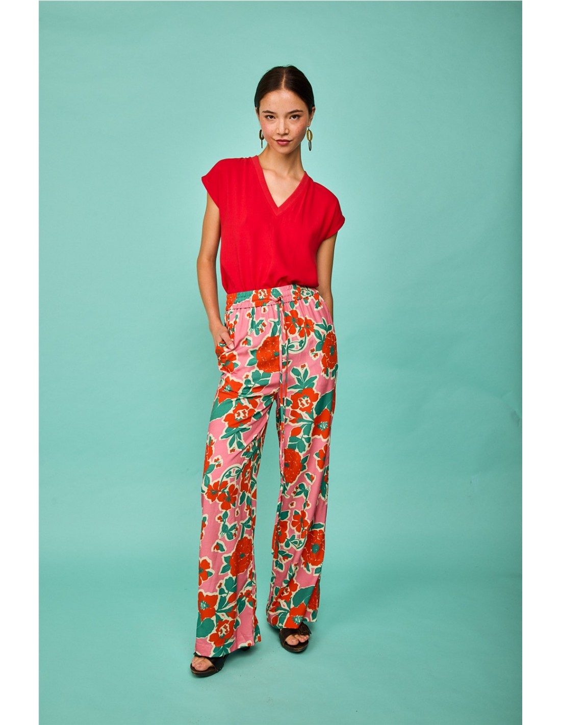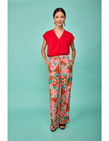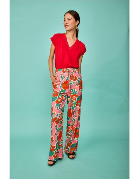 El pantalón modelo Arnia Rosa de Smile es una prenda fresca y llamativa, confeccionada en un tejido ligero con caída fluida. Presenta un estampado floral vibrante en tonos rosa, rojo y verde, cintura elástica con cordón ajustable y corte amplio de pierna recta que aporta comodidad y estilo. Ideal para looks veraniegos llenos de color.