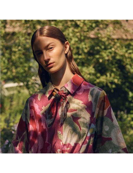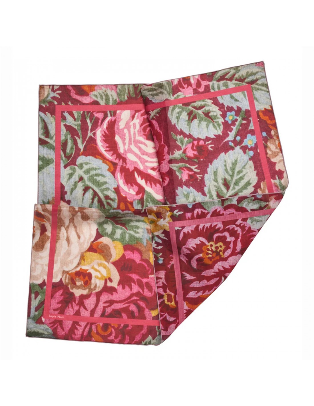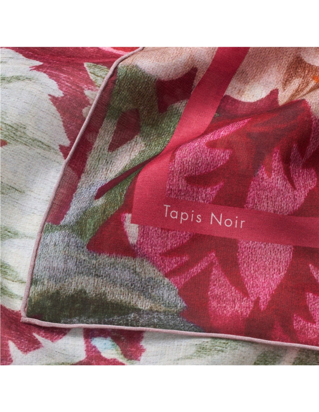 Pañuelo confeccionado en una suave mezcla de algodón y seda, su estampado se basa en un muestrario textil español de la década de 1910, seleccionado del archivo interno de telas antiguas de la marca. Los bordes están enrollados y cosidos a mano. Si tienes dudas sobre el color, mira la foto plana del pañuelo, ya que es la más precisa. - 66 x 66 cm - 70 % algodón, 30 % seda - Solo limpieza en seco - Incluye bolsa protectora Tapis Noir.