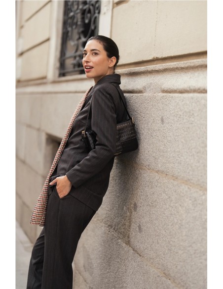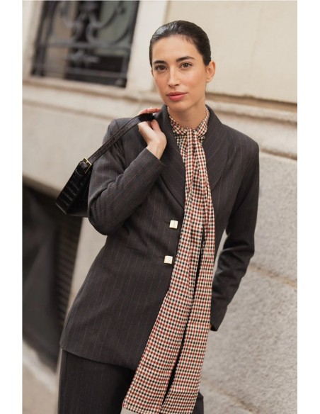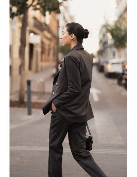 La blazer Grenat es una pieza que fusiona la sofisticación clásica con un aire contemporáneo y atrevido. Su diseño de finas rayas en tono granate sobre fondo azul gris oscuro crea un contraste sutil pero perfecto que realza la silueta femenina. Lleva cuatro botones dorados en la parte frontal, cuello recto y las mangas largas estilizan la figura, mientras que el cinturón opcional permite ceñir la cintura para un look más definido. Esta forrada por completo con acabados impecables.