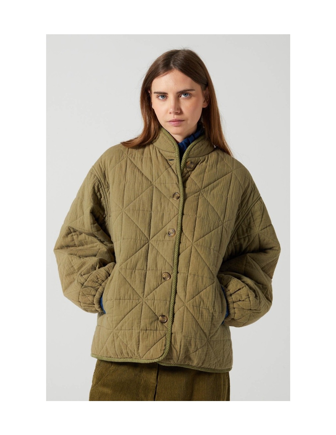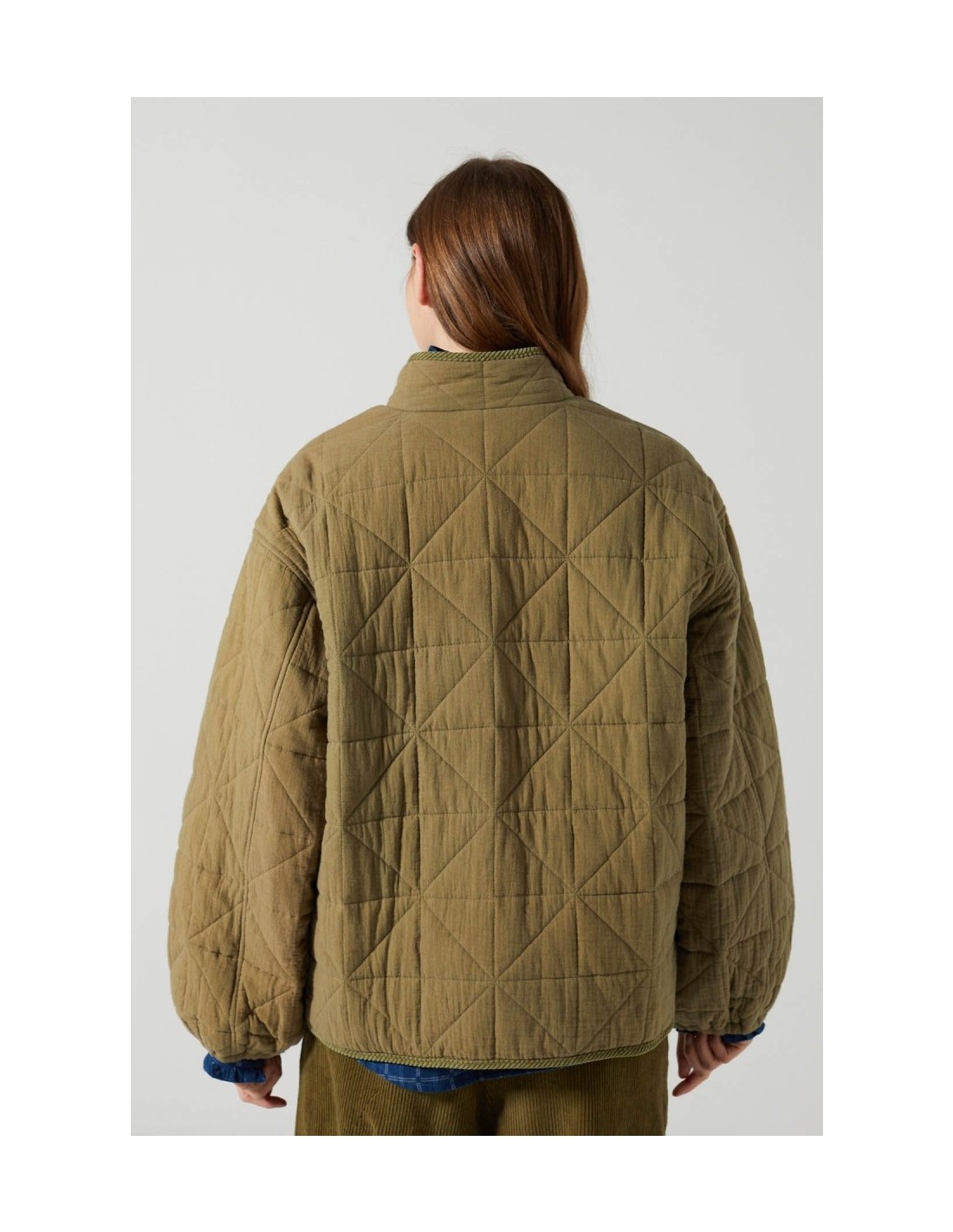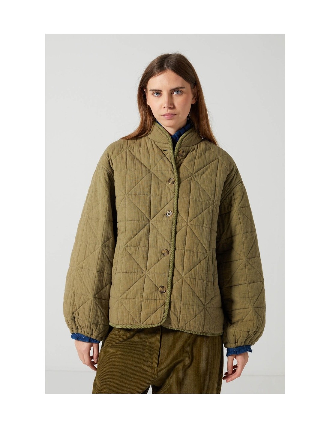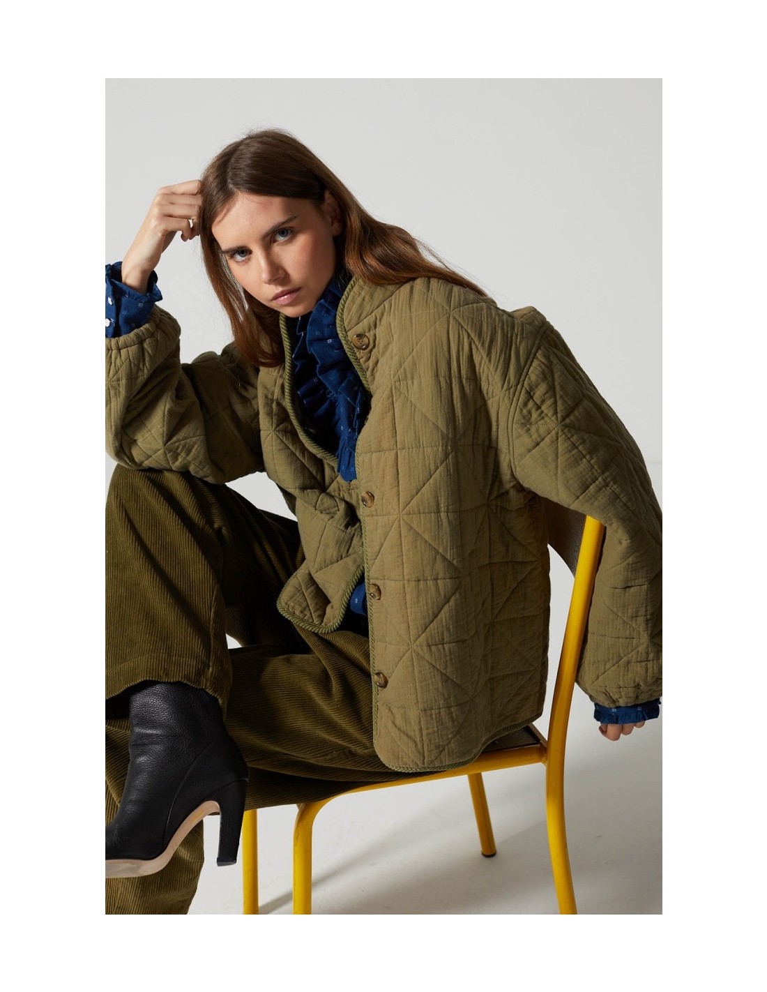 La chaqueta Kamilla es una prenda acolchada con un toque femenino, ideal para el otoño e invierno. Su diseño combina funcionalidad, comodidad y elegancia. De corte recto ligeramente oversize, cuello alto, botones frontales en dos tonos, mangas ligeramente abullonadas, dos bolsillos delanteros y acabado ribeteado en pana. Es ideal para llevar sobre blusas vaporosas o jerséis finos. Puedes combinarla con pantalones rectos, vaqueros o incluso vestidos midi para un look boho chic.