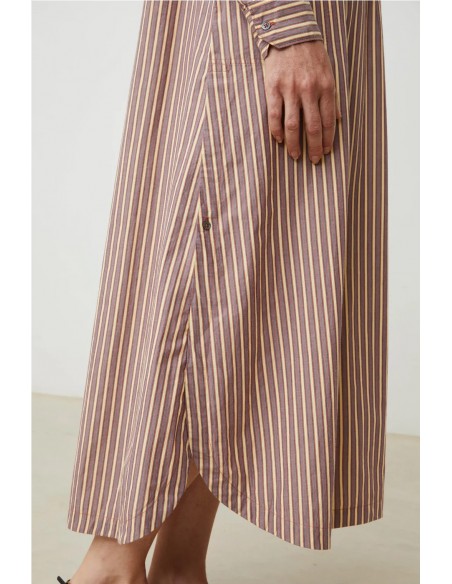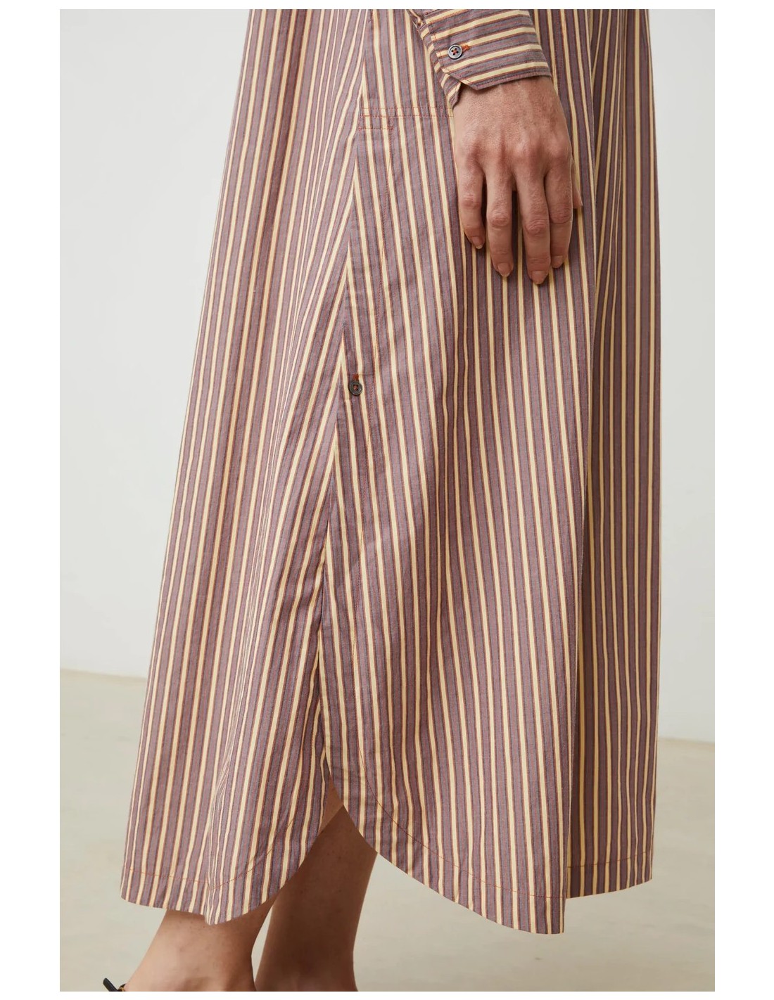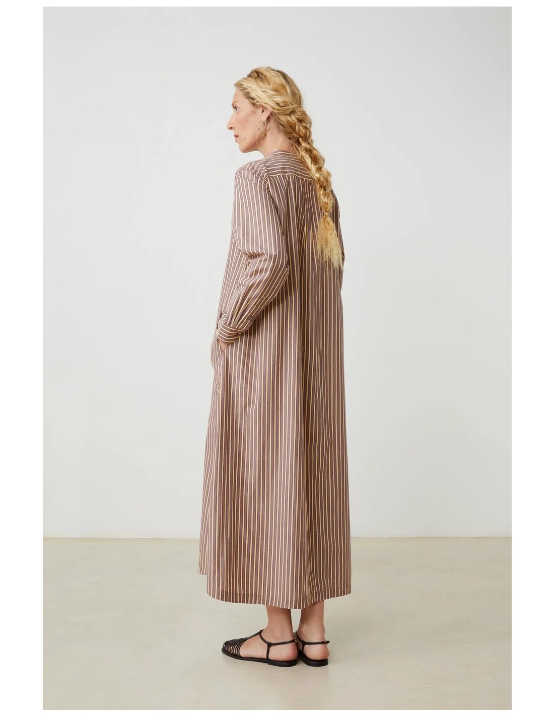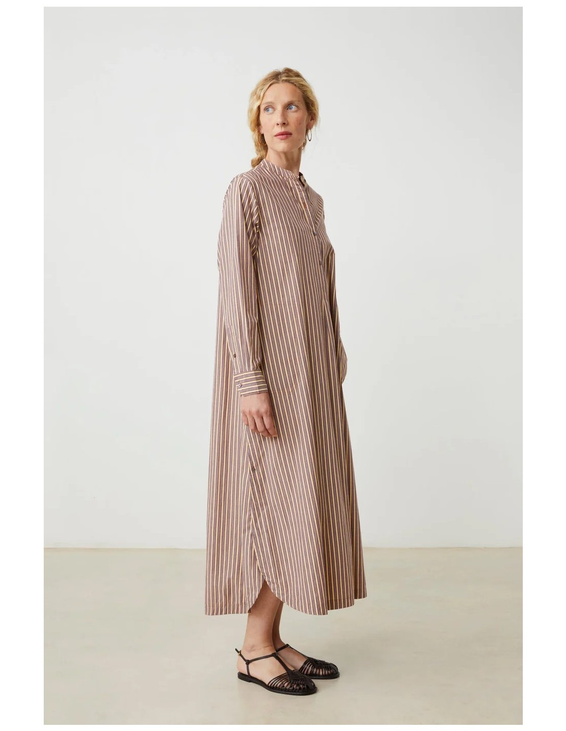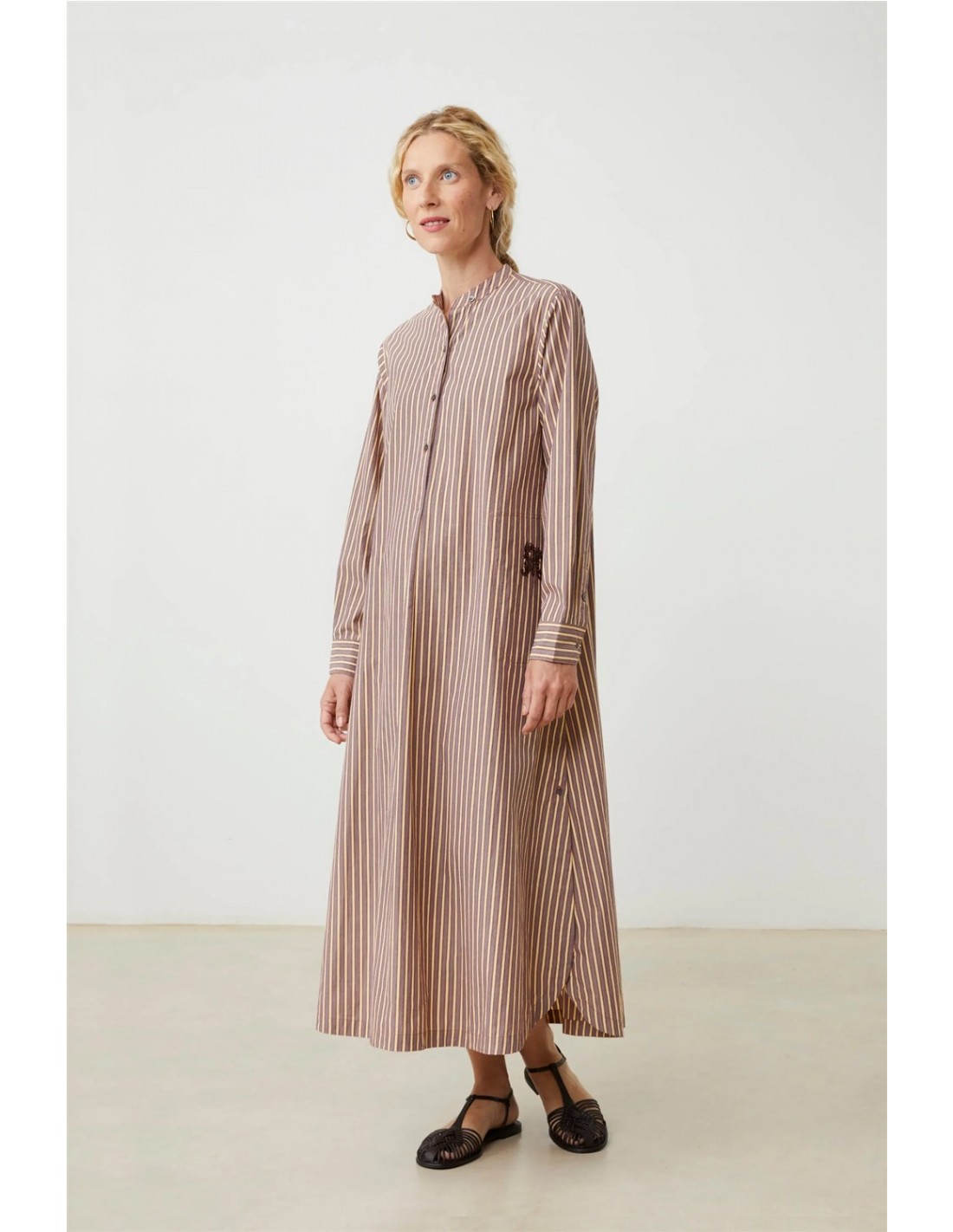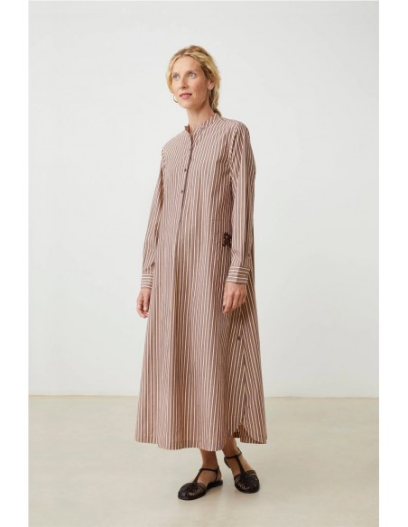 El vestido Chloé de Moismont es una prenda larga y ligera, con un aire femenino y relajado. Presenta un corte ligeramente evasé que aporta movimiento, cuello redondo y mangas largas con botones, además de un detalle de pechera frontal que le da un toque delicado. Confeccionado en algodón, es cómodo y fresco, ideal tanto para un look de verano en la ciudad como para días más tranquilos cerca del mar.